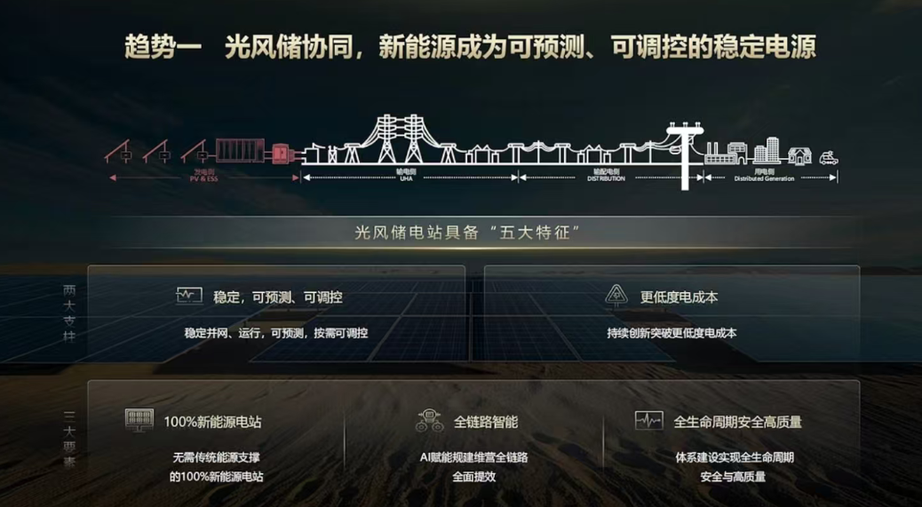 我们需要持续的技术创新迭代,不断降低度电成本,让清洁成本走向千家万户。下面有三大要素:新能源100%的独立运行,未来的光风储大基地必须不依赖传统电源支撑的独立稳定运行能力,真正实现新能源的自主供电闭环;二、全链路的智能协同,光风储大基地内部设备种类多,多系统耦合关系复杂,只有通过全链路的智能化管理,才能实现高效运行,快速响应的双重目标;三、全生命周期的高安全、高质量、稳定是发电单元的核心底线,未来的大基地必须以全生命周期的安全可靠为基础,筑牢能源供应的安全屏障。