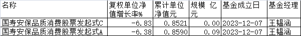 据数据显示,在刚过去的2025年,国寿安保基金旗下的国寿安保品质消费股票发起式C、国寿安保品质消费股票发起式A分别下跌6.83%和6.38%。
