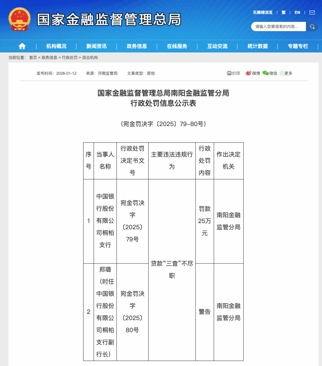 1月12日,国家金融监督管理总局南阳金融监管分局发布的行政处罚信息公示表显示,中国银行桐柏支行因“贷款‘三查’不尽职”被罚款25万元;同时时任中国银行股份有限公司桐柏支行副行长郑璐被予以警告。