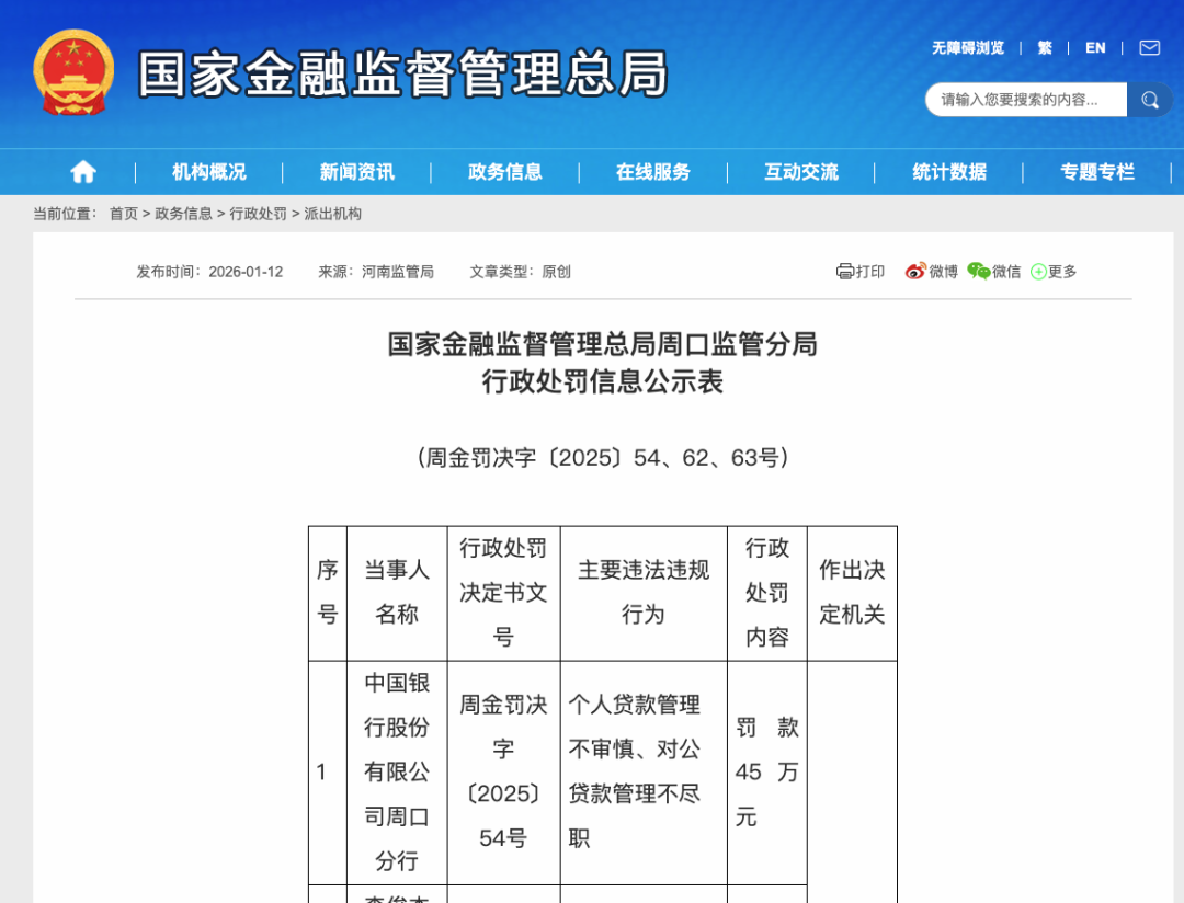 同样因贷款管理问题而被处罚的还有中国银行周口分行。