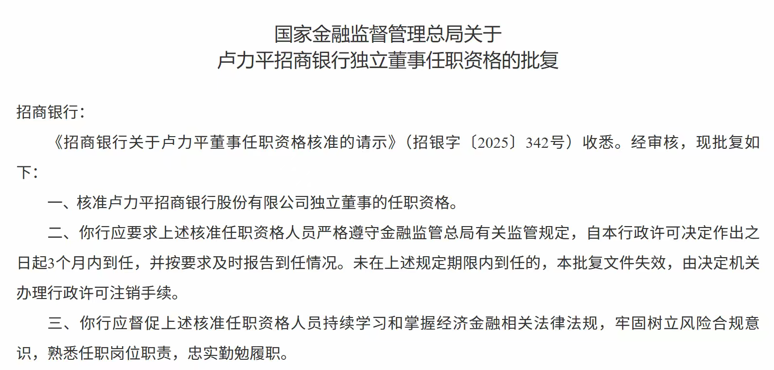 1月5日,国家金融监督管理总局发布关于卢力平招商银行独立董事任职资格的批复,核准卢力平招商银行股份有限公司独立董事的任职资格。