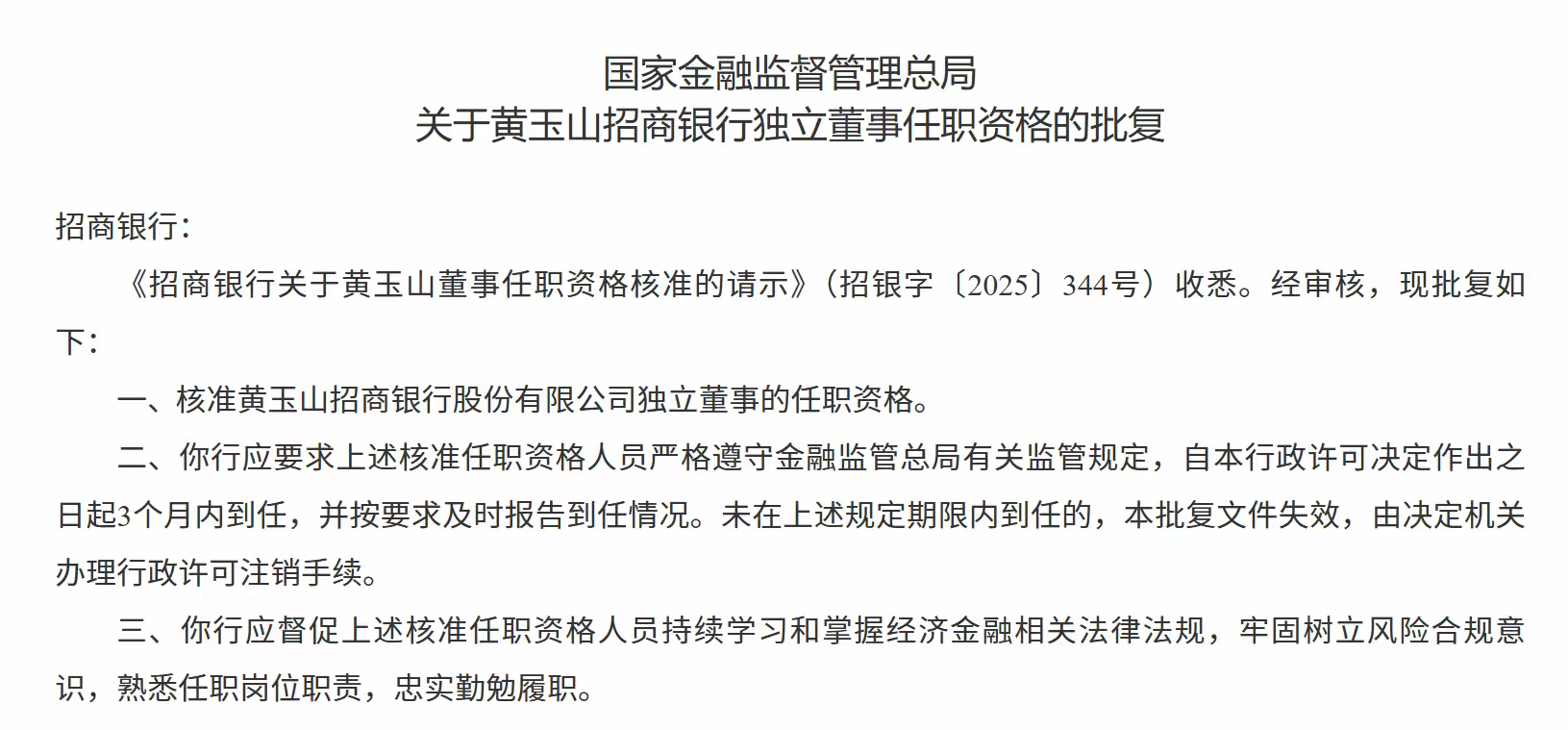 1月5日,国家金融监督管理总局发布关于黄玉山招商银行独立董事任职资格的批复,核准黄玉山招商银行股份有限公司独立董事的任职资格。