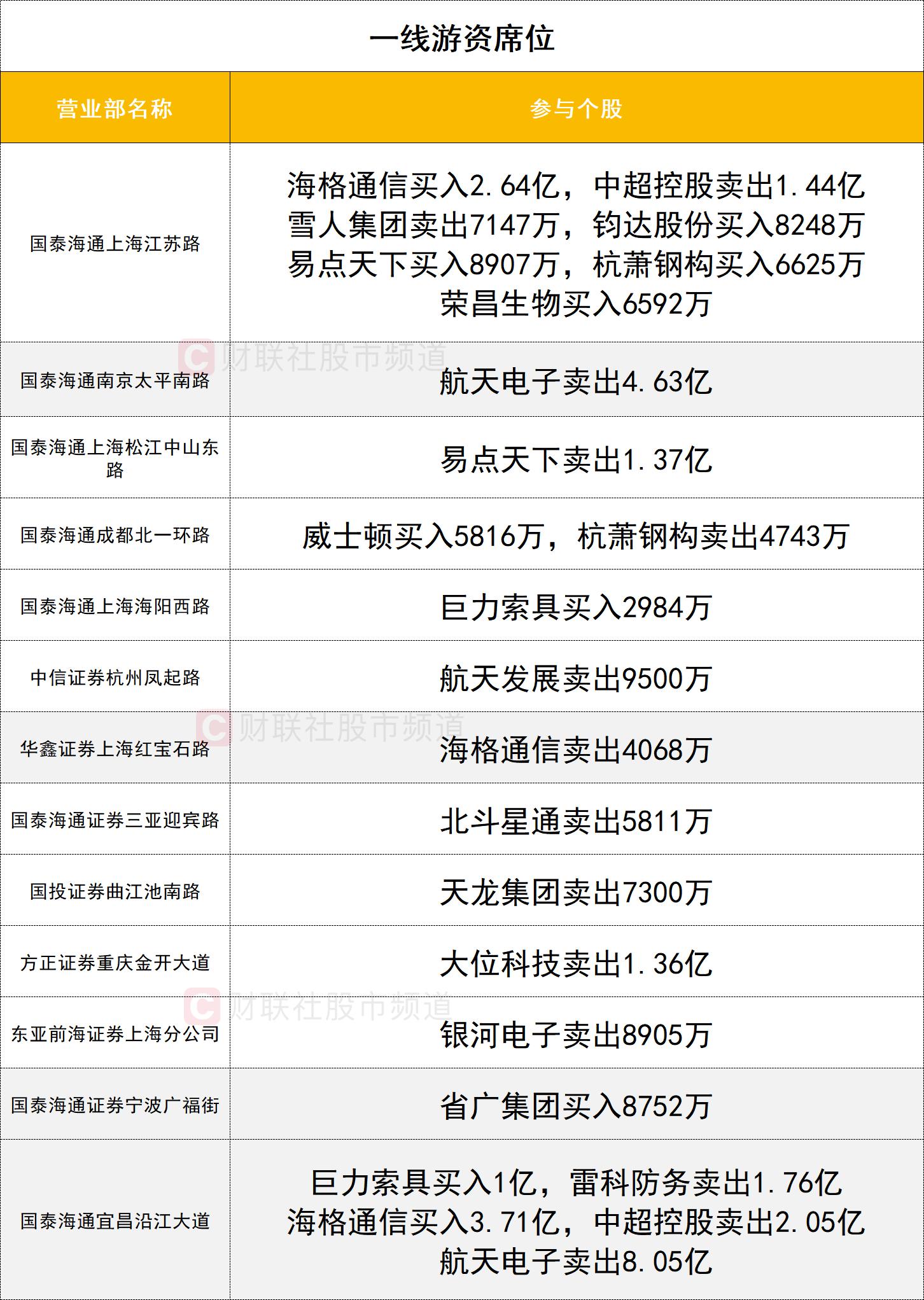 一线游资活跃度较高,海格通信走出2连板,获两家一线游资(国泰海通证券宜昌沿江大道、国泰海通证券上海江苏路)分别买入3.71亿、2.64亿,同时遭一家一线游资(华鑫证券上海红宝石路)卖出0.4亿。航天电子遭两家一线游资(国泰海通证券宜昌沿江大道、国泰海通证券南京太平南路)合计卖出12.68亿。