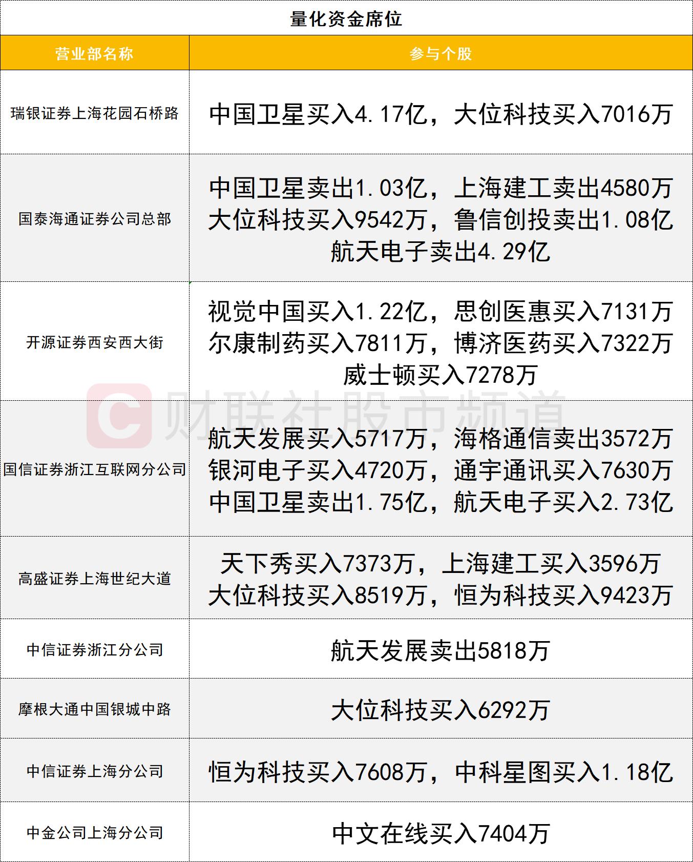 量化资金活跃度明显提升,航天电子获一家量化资金(国信证券浙江互联网分公司)买入2.73亿,同时遭一家量化资金(国泰海通证券总部)卖出4.29亿。