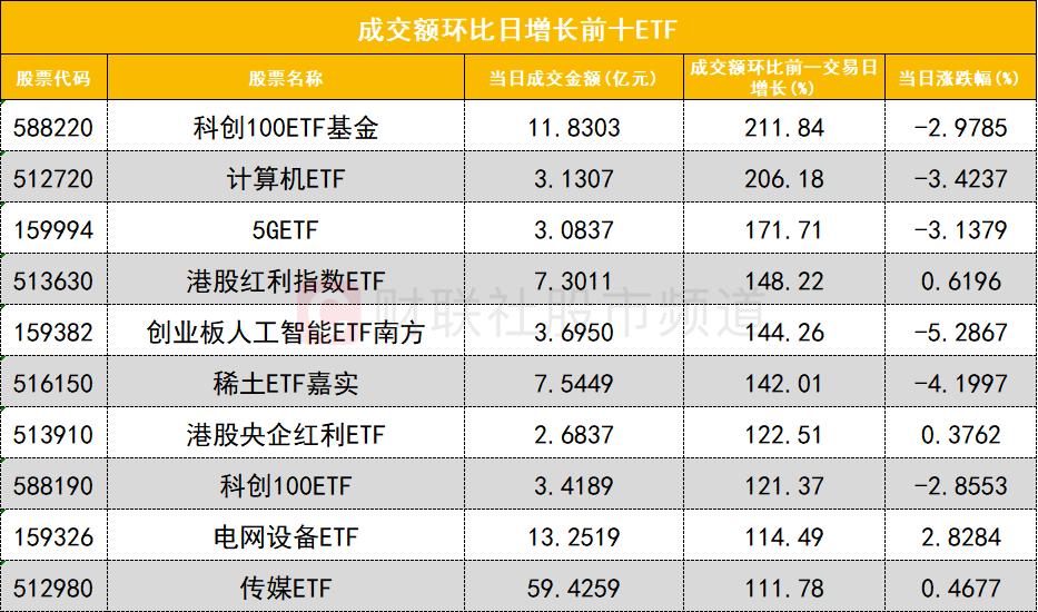 从成交额环比增长前十的ETF来看,科创100ETF基金(588220)成交额环比增长211%位居首位;计算机ETF(512720)成交额环比增长206%位居次席。