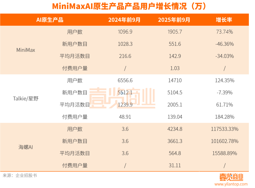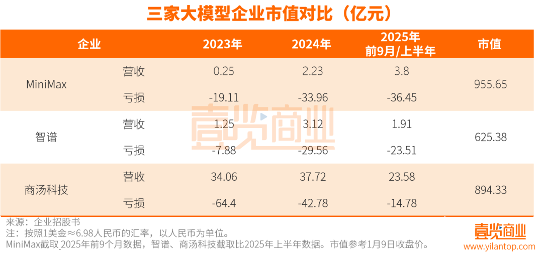 与耀眼的榜单评测相反的,是其略显刺眼的基本面——高增长+高亏损:MiniMax在2023年录得346万美元收入,净亏损2.69亿美元;2024年收入3052.3万美元,净亏损4.65亿美元;2025年前9月5343.7万美元,净亏损5.12亿美元,通俗来说就是“卖1块赔10块”。