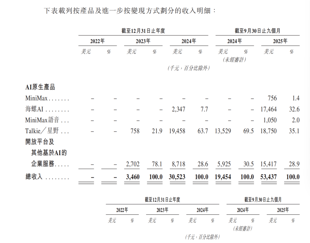 招股书显示,2025年前9个月,MiniMax面向个人用户的AI原生产品贡献了71.1%的收入。具体来看,MiniMax围绕情绪陪伴、多模态内容生成等高频场景,推出了Talkie、海螺AI等AI原生产品。这类产品强调使用频率与用户黏性,更接近互联网产品逻辑。对应的变现方式也更为多元,主要有订阅、应用内付费、广告三种方式。