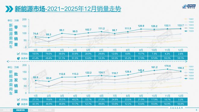 前不久,乘联会公布了12月份国内乘用车市场新能源零售渗透率,达到创新高的59.1%,2025年3月起新能源在国内零售市场中的渗透率就越过50%的分界点。