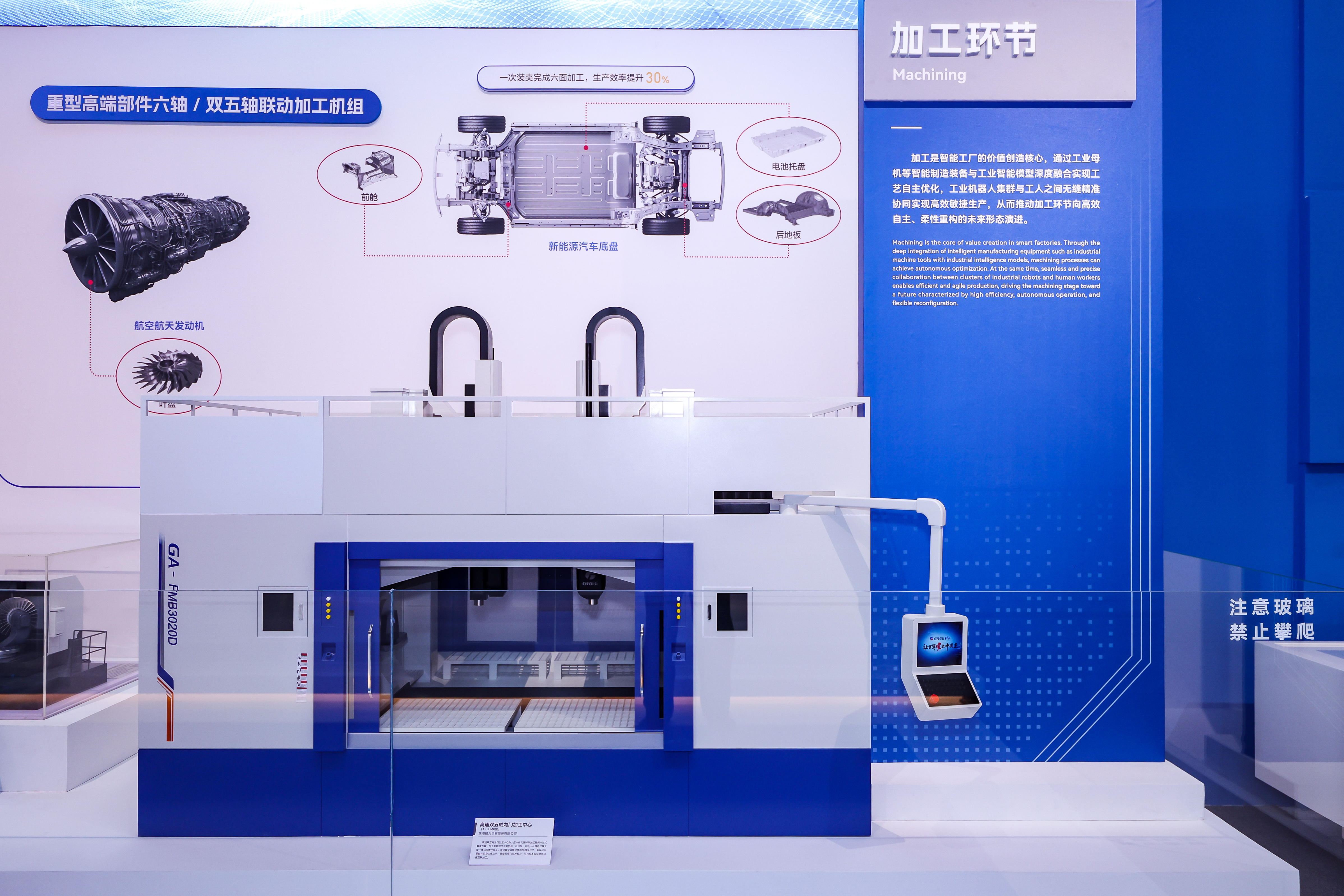 同样备受瞩目的,还有荣获2025年日内瓦国际发明展金奖的格力高速双五轴龙门加工中心的1:3.6比例微缩模型。该数控机床采用直驱方案,光栅尺全闭环控制,最高运行速度120m/min,最大加速度1.1mm/s2,11轴联动加工,一次装夹可完成汽车前舱、电池托盘、后地板等车身部件的六面加工,生产效率较传统方案提升30%以上,推动了国产高端五轴机床在关键领域落地应用。
