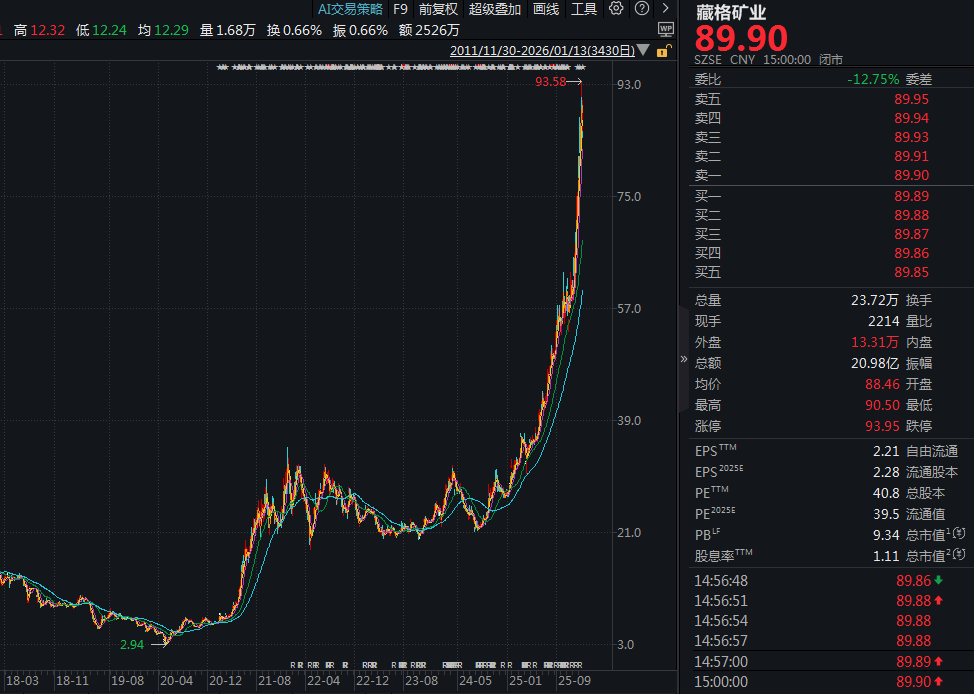 截至1月13日收盘,藏格矿业涨超5%,股价89.9元/股,总市值1412亿元。