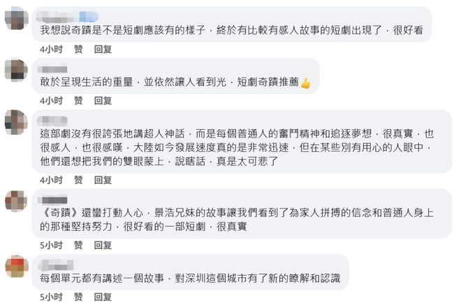 在“看台海”的海外社交平台账号及相关的影视剧账号下,甚至有很多(中国)台湾网友热情留言,身在(中国)台湾的他们,通过《奇迹》,看到了深圳的发展与大陆的进步,“大陆奇迹令人赞叹”,“有了新的了解和认识”。