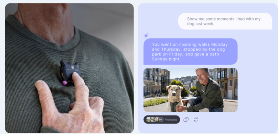 更令人惊喜的是其多模态交互能力,用户可以通过机身触控板、语音或手机APP与设备对话,询问[我今天吃了什么?][找出和家人相处的片段]等问题,AI会快速检索相关素材并呈现。