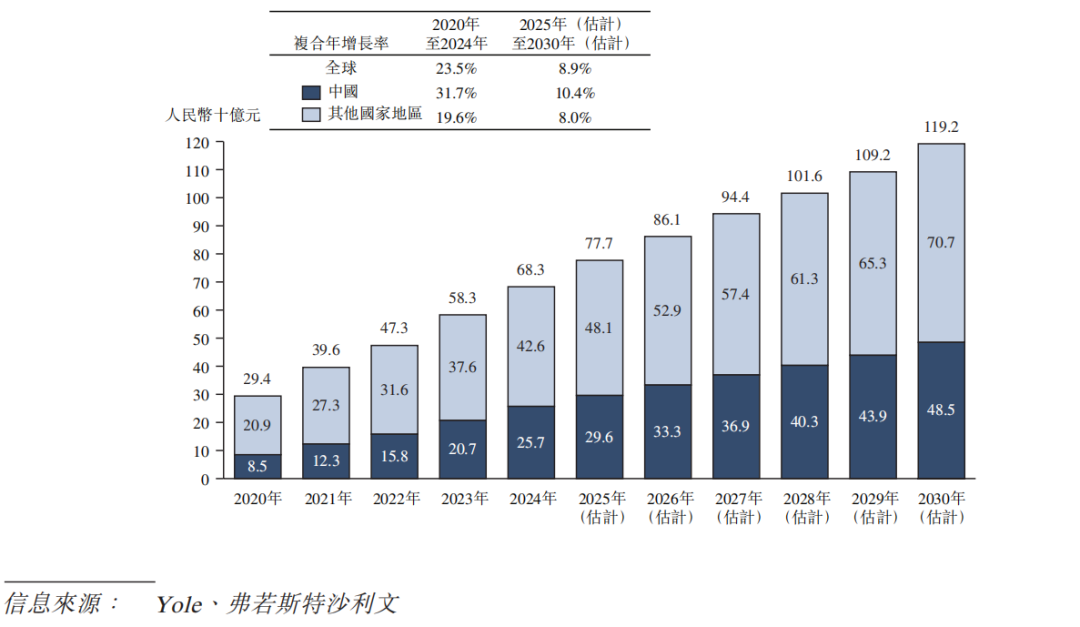 根据弗若斯特沙利文(Frost & Sullivan)报告,2020年至2024年,市场规模由人民币294亿元增长至人民币683亿元,复合年增长率约23.5%;预计2025年至2030年,市场将以约8.9%的复合年增长率持续扩大,规模有望从2025年的人民币777亿元增长至2030年的人民币1,192亿元。