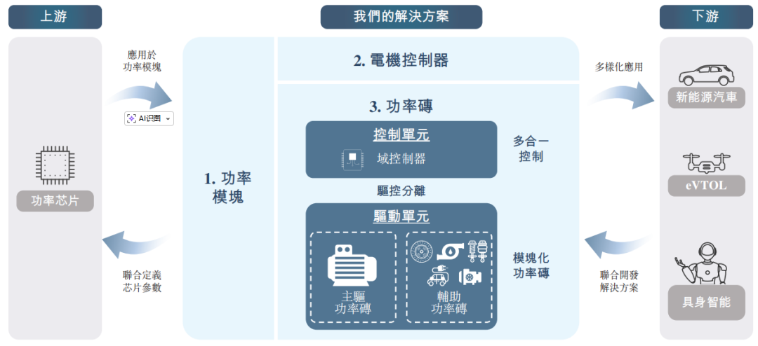 公司的解决方案组合已从传统的功率模块和电机控制器扩展至全面的功率砖组合,包括主驱功率砖、部署于动力域和底盘域的辅助功率砖,以及集成式域控制器。