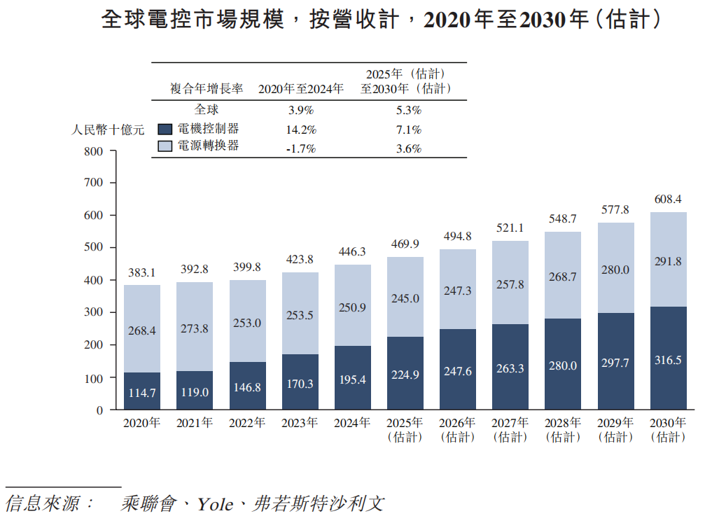 根据弗若斯特沙利文(Frost & Sullivan)报告,电机控制器市场规模由2020年的人民币1,147亿元增至2024年的人民币1,954亿元,复合年增长率达14.2%。展望未来,在eVTOL、具身智能机器人及新能源汽车市场持续扩张的支持下,电机控制器市场有望保持稳定增长,至2030年达到人民币3,165亿元。