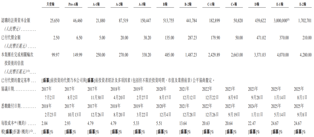 公司上市前经历了多轮融资,累计融资逾17.8亿元人民币。在2025年8月的E-2轮最新融资中,公司的投后估值约为42.8亿人民币。
