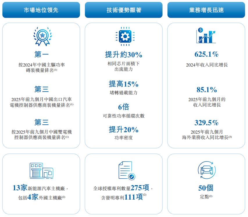 · 主驱功率砖:就主驱功率砖而言,2024年及截至2025年9月30日止九个月,公司分别排名第一及第二。就双电机控制器中安装的功率砖而言,截至2025年9月30日止九个月,公司排名第一;
