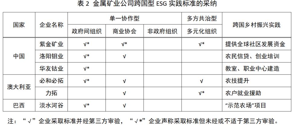 就跨国型ESG实践标准看,我国矿业公司的制定参与率与规则采纳率都偏低,但这方面的消极表现不代表我国矿业公司也较少参与个别的ESG项目。表2将国际国内采纳情况对比,并通过跨国乡村振兴项目实践来凸显我国优势。
