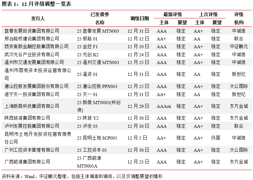 12月全市场信用债有14家主体发生评级调整。均为评级上调,其中11家为产业主体,所属申万行业主要涉及商贸零售(2家)、电子(1家)、建筑装饰(1家)、非银金融(1家)、交通运输(1家)等;3家为城投主体。具体信息见附表1。