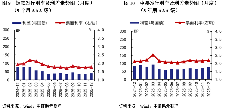 主要信用债品种的收益率走势方面,12月份,270天AAA级别中债中短期票据平均到期收益率为1.71%,较前一月上行4BP,平均利差为34BP,较前一月扩大6BP;3年期AAA级别中债中短期票据平均到期收益率为1.91%,较前一月上行3BP,平均利差为50BP,较前一月扩大6BP。