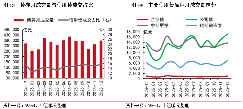 二级成交:12月债券总成交37.7万亿元,环比上升10.60%。其中信用债成交额占比为15.66%,环比上升0.62PCT;