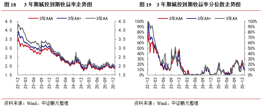 12月末,3年期AAA、AA+和AA级城投到期收益率的近三年分位数分别行至14%、14%、12%,本月城投债收益率分位数整体在9%-28%区间,处于近三年的底部。
