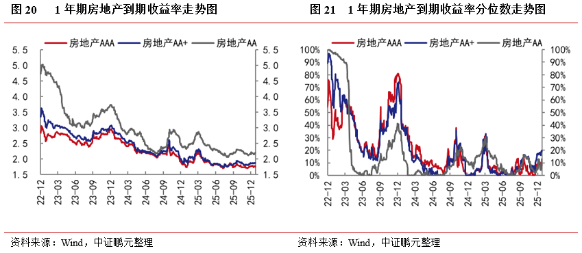 12月末,1年期AAA、AA+和AA级地产债到期收益率的近三年分位数分别行至8%、19%、12%,本月地产债到期收益率分位数整体在4%-20%区间,处于近三年的底部。
