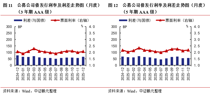 收益率:12月末,信用债和利率债收益率涨跌互现,1-3年期为主要下行期限,7年及以上为主要上行期限;利率债变化幅度居于-8BP至10BP之间,其中30年期品种上行幅度最大;信用债变化幅度居于-10BP至6BP之间,其中7、10年期品种上行幅度均较大;
