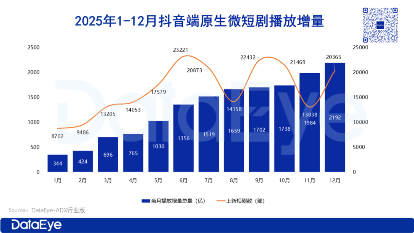 2025年端原生微短剧市场播放量实现全年爆发式增长,播放规模一路攀升,月度播放增量从343.62亿狂飙至2192.04亿,增长势头强劲。