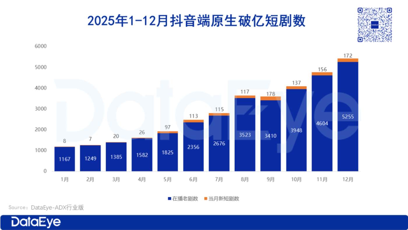 抖音端原生累计播放量破亿的微短剧中,短剧数从1月的1175部持续增长至12月的5427部,整体呈稳步上升态势,说明抖音端能达到“亿级播放量”的微短剧规模在不断扩大。
