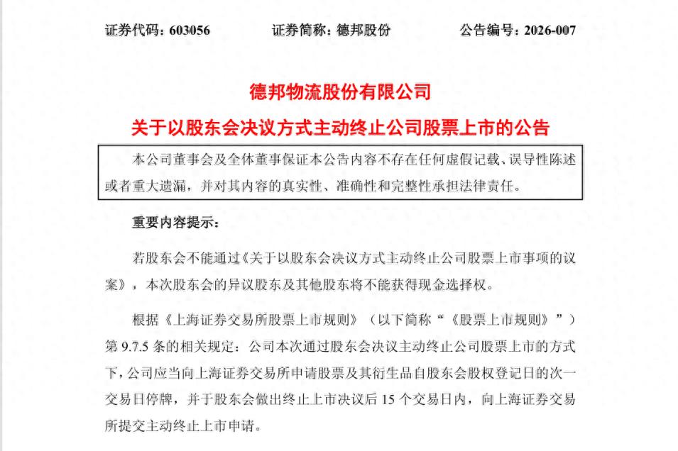 德邦即将告别资本市场。1月13日晚,德邦物流股份有限公司(简称“德邦股份”)在上交所披露公告表示,公司将主动终止股票上市。