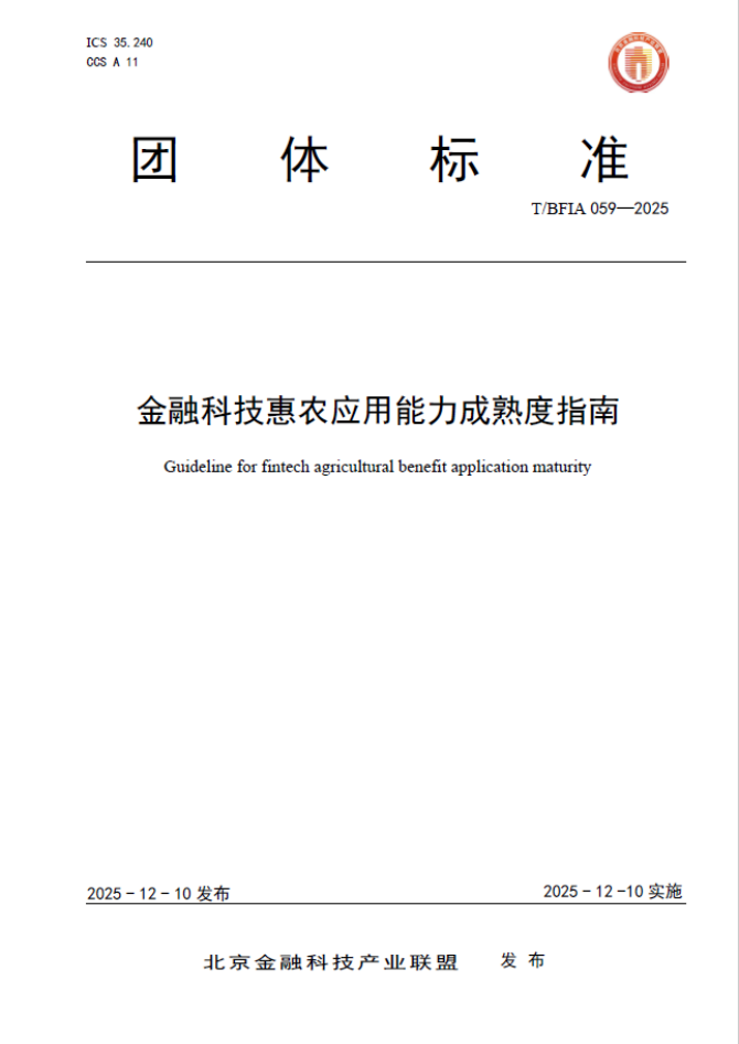 近日,由银联数据深度参与编制的《商业银行互联网贷款核心系统建设指南》(T/BFIA 060-2025)、《数字金融反欺诈信息分类及编码》(T/NIFA 34-2025)、《金融科技惠农应用能力成熟度指南》(T/BFIA 059-2025)三项金融科技团体标准正式发布实施。三项标准精准对接国家战略与监管要求,覆盖金融服务实体经济关键环节,为金融机构推进数字信贷合规经营、强化风险防控能力、践行普惠金融理念提供明确技术指引,助力构建行业高质量发展新格局。