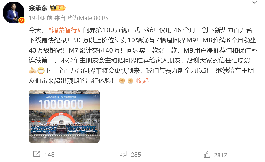 问界刷新百万交付最快纪录