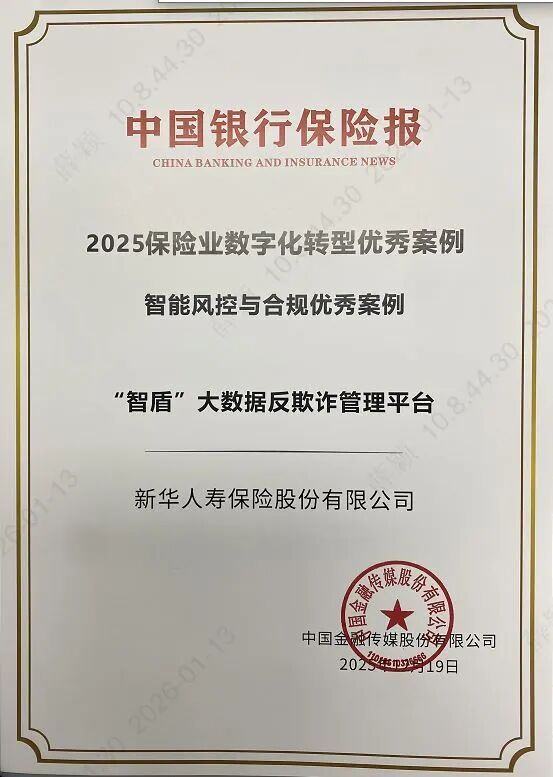 近日,由《中国银行保险报》主办的“2025保险业数字化转型案例”征集活动正式揭晓结果。新华保险“智盾”大数据反欺诈管理平台成功获评“2025保险业数字化转型优秀案例”。