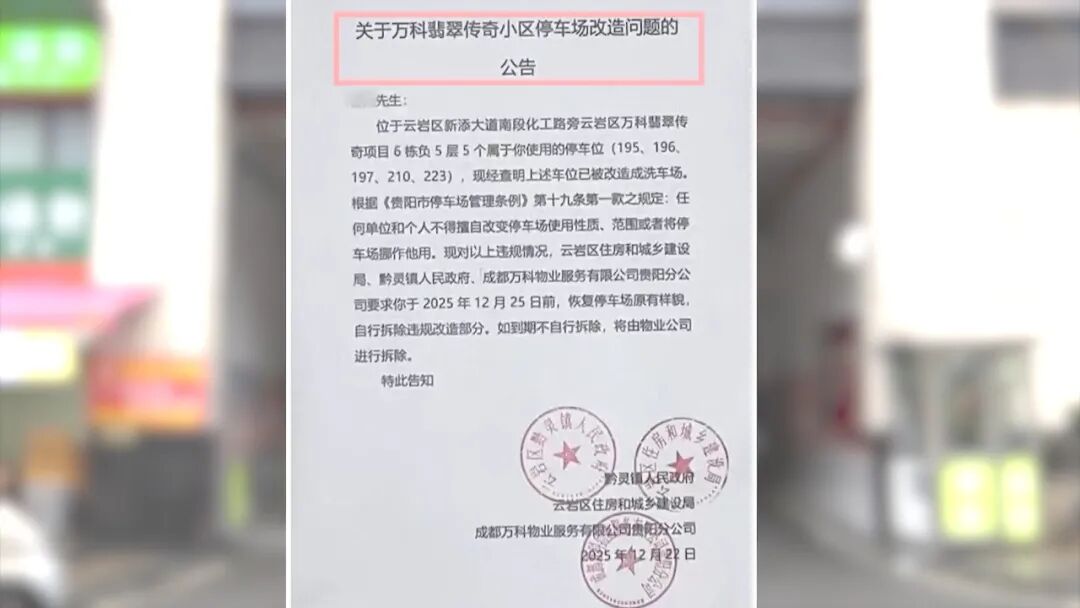 现场办公会结束后,云岩区住房和城乡建设局、云岩区黔灵镇人民政府及小区物业公司于2025年12月22日联合向车位改造方发布了《关于万科翡翠传奇小区停车场改造问题的公告》。公告明确指出,位于该小区6栋负5层的五个车位经查明已被改造成洗车场,该行为违反《贵阳市停车场条例》第十九条第一款“任何单位和个人不得擅自改变停车场使用性质、范围或者将停车场挪作他用”之规定。要求于2025年12月25日前恢复停车场原貌,自行拆除违规改造部分。