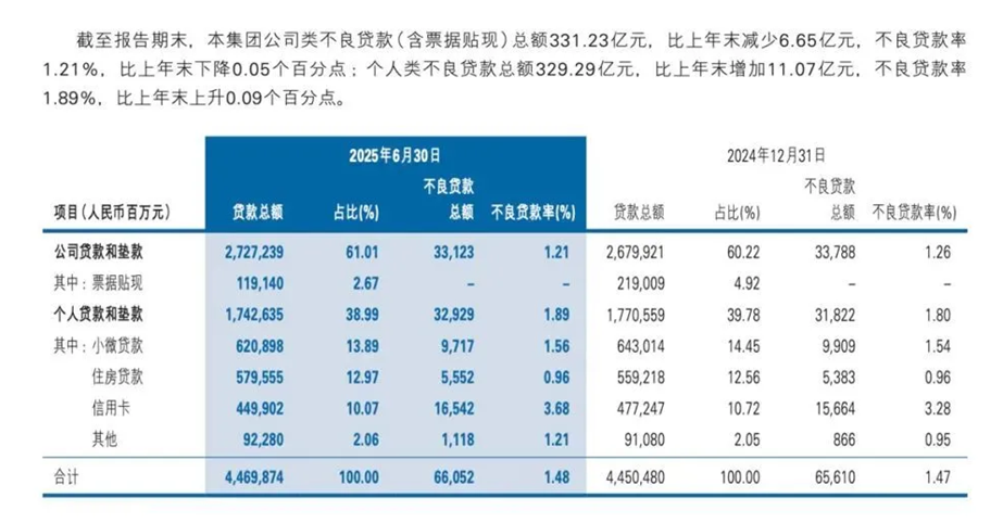 截至2025年6月末,该行信用卡不良贷款率升至3.68%,较上年末提高0.4个百分点,不良贷款余额达到165.42亿元,半年内增加8.78亿元,明显高于住房按揭、小微贷款等其他个人贷款品类。同时,信用卡透支余额同比减少273.45亿元,降至4499.02亿元,业务规模与资产质量同步承压,使信用卡业务处于相对被动的位置。