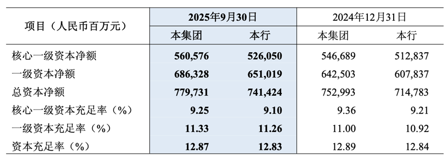 资本充足情况亦面临约束。截至2025年9月末,民生银行核心一级资本充足率为9.25%,一级资本充足率11.33%,资本充足率12.87%,虽均符合监管要求,但较上年末均有所下滑。在贷款投放乏力、内生资本补充能力减弱的情况下,资本约束对业务发展的影响逐步显现。