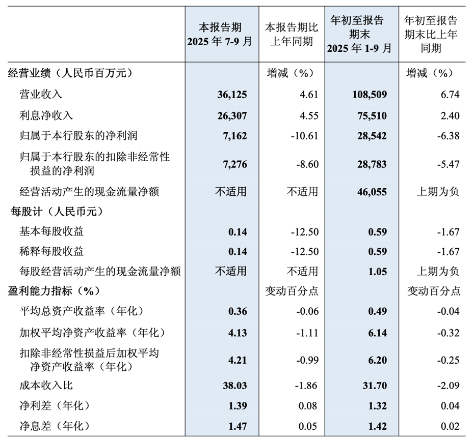 2025年前三季度,民生银行实现营业收入1085.09亿元,同比增长6.74%,但归母净利润仅285.42亿元,同比下降6.38,第三季度单季净利润71.62亿元,同比降幅扩大至10.61%,呈现出典型的“增收不增利”特征。
