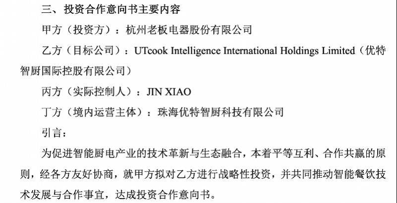 老板电器公告显示,目标公司及其境内运营主体正在实施股权变更,经各方协商,公司未来拟以目标公司股权重组完成后的股权结构为基础,向其投入人民币1亿元认缴其股本。公告显示,乙方(UTcook Intelligence International Holdings Limited)是一家依据开曼群岛法律设立并存续的公司,股本为50000美元,分为5亿股普通股,每股面值 0.0001 美元。