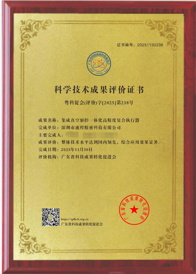 深圳市速程精密科技有限公司自主研发的“集成真空驱控一体化高精度复合执行器”通过权威机构科学技术成果评价,凭借在精密机构设计、运动控制算法等核心领域的突破性创新,被认定为技术水平国内领先,综合应用效果显著.标志着我国ZR机械手细分领域实现关键技术自主可控,为高端制造业自动化升级注入强劲动能。