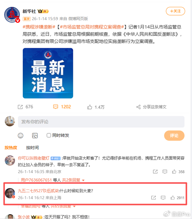 而就在市场监管总局的一纸立案调查公告,将携程集团推上风口浪尖的同时,壹度PRO发现,在新华社发布携程被查的新浪微博下,有网友表示,“什么时候轮到大麦?”