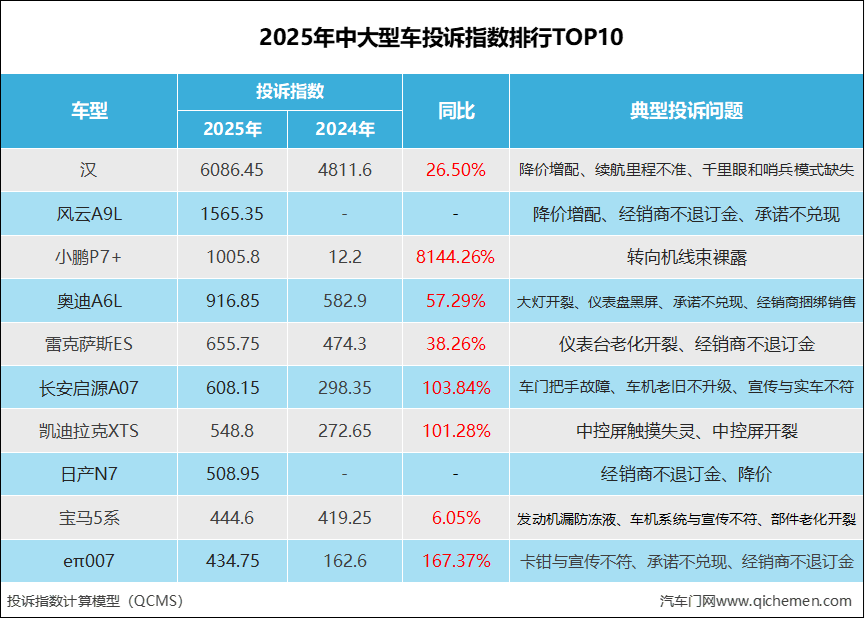 数据显示:2025年度中大型车投诉指数达到了17461.3,同比上涨了68%。从投诉榜单来看,前十名中大型车的投诉指数悉数出现了同比上涨。这其中,小鹏P7+的投诉指数同比涨超81倍,空降榜单第三名。长安启源A07、凯迪拉克XTS、eπ007的投诉指数亦有明显涨幅,翻了一倍有余。值得一提的是,去年上市的两款新车风云A9L和日产N7也登上了投诉榜单,分列榜单第二、八名。