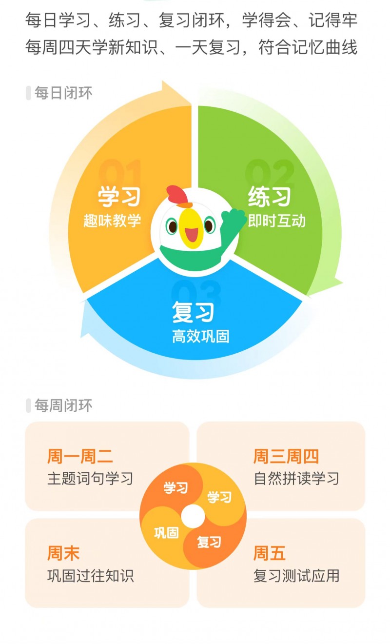 在学习体系构建方面,叽里呱啦通过AI技术强化了“学—练—用—复习”的闭环设计。课程整合动画教学、外教实景课堂与多种互动练习形式,在高频交互中提升专注力与理解效率;智能复习系统基于记忆曲线和学习行为数据,对薄弱点进行定位并推送复习内容,形成“日闭环”与“周闭环”的双重节奏。此外,产品通过“呱呱小屋”等互动机制,将学习成果与趣味体验结合,以主题道具与角色互动增强持续学习动力。