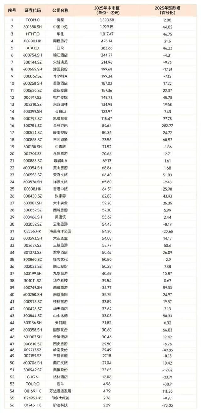 从全年数据看,板块的“头部效应”不仅没有削弱,反而进一步固化。携程集团-S(09961.HK/TCOM.US)与华住集团-S(01179.HK/HTHT.US)作为贯穿游客行程的线上枢纽与线下支柱,其市值表现始终稳健。1月12日,一位长期跟踪消费板块的私募基金经理在接受记者采访时指出:“在当前环境下,资本首要追求的是确定性。这些龙头企业的网络效应、品牌认知和抗风险能力,构成了足够深的护城河。”同样,中国中免(601888.SH)在免税领域的绝对主导地位,使其继续成为各大机构投资组合中不可或缺的配置核心。与之形成鲜明对比的,是大量业务模式单一或地域局限性强的地方文旅企业。记者梳理发现,如西安旅游(000610.SZ)、云南旅游(002059.SZ)等公司,市值表现平淡,日交易量时常徘徊在低位。某证券公司负责人李经理向记者解释:“这些公司并非没有资产,但在当前市场看来,其成长故事缺乏想象空间,盈利的弹性和可持续性存疑,难以吸引增量资金关注。”