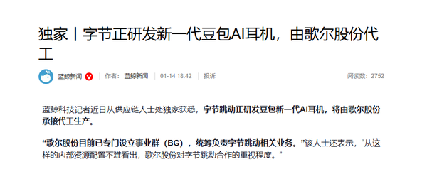 曝字节跳动正研发新一代豆包AI耳机 由歌尔股份代工