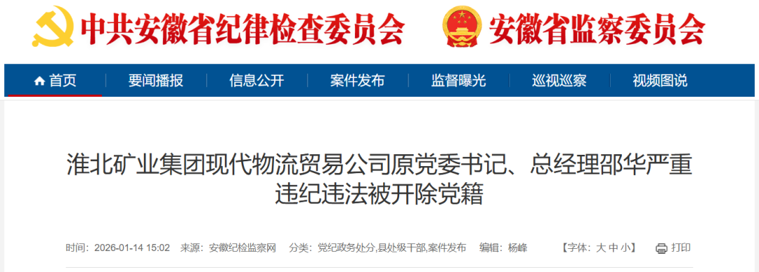 日前,经安徽省纪委监委指定管辖,淮南市纪委监委对淮北矿业集团现代物流贸易公司原党委书记、总经理邵华严重违纪违法问题进行了立案审查调查。