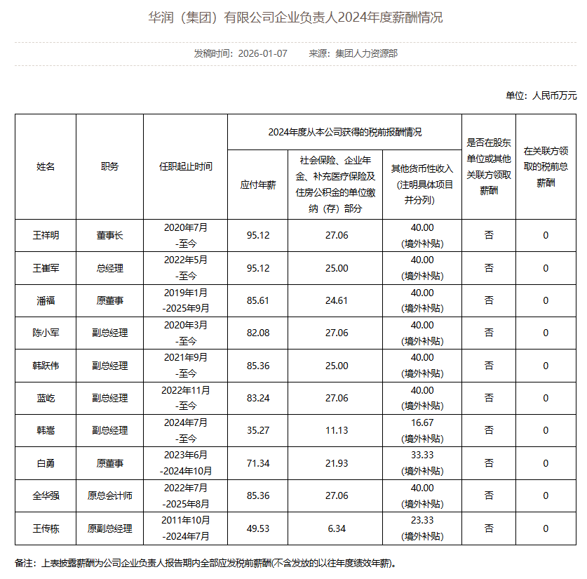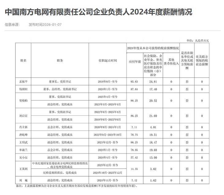 以下为部分央企负责人2024年度薪酬信息: