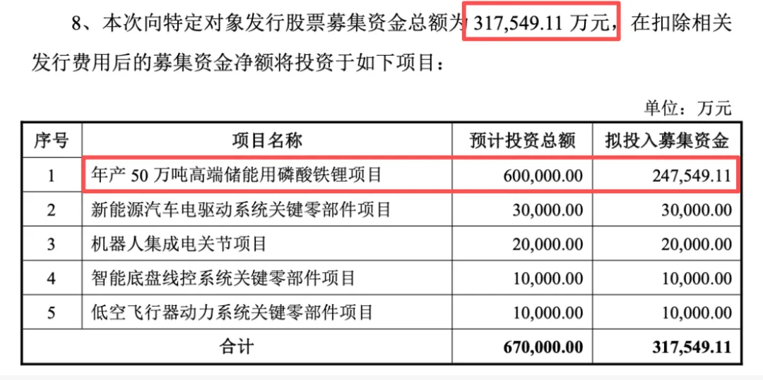 具体方案:本次向宁德时代定增预计募集资金总额(含发行费用)为31.75亿元。后续将用于年产50万吨高端储能用磷酸铁锂项目、新能源汽车电驱动系统关键零部件项目、机器人集成电关节项目、智能底盘线控系统关键零部件项目及低空飞行器动力系统关键零部件项目。本次发行完成后,宁德时代直接持有上市公司股份预计超过5%。