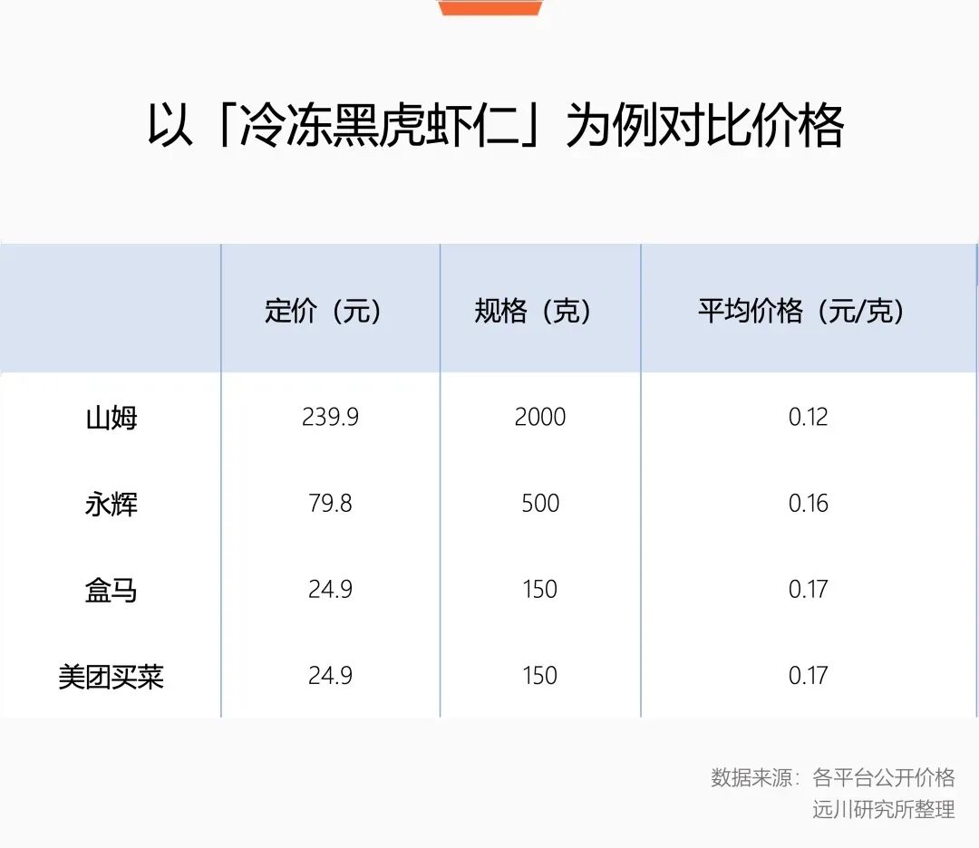 举例来说,一般的超市SKU都有上万个,山姆和Costco只有4000个左右。我们曾统计了山姆在售的近200件肉类食材,平均价格在189元,1——2kg的大包装拉高了总价,但单价并不比“普通超市”贵。