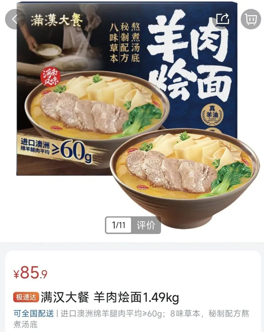 第二类是“山姆独占”商品,即品牌和供应商专门为山姆定制,只在山姆渠道销售,别的地方买不到(不算代购)。比如下图中统一的满汉大餐羊肉烩面,只能在山姆买到:
